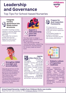 These practical top tips summarise key learning from a series of in-depth interviews conducted in 2025 with leaders from a diverse range of school-based nurseries (SBNs). They are designed to help all schools in their planning for both established and new SBNs and cover a range of themes: